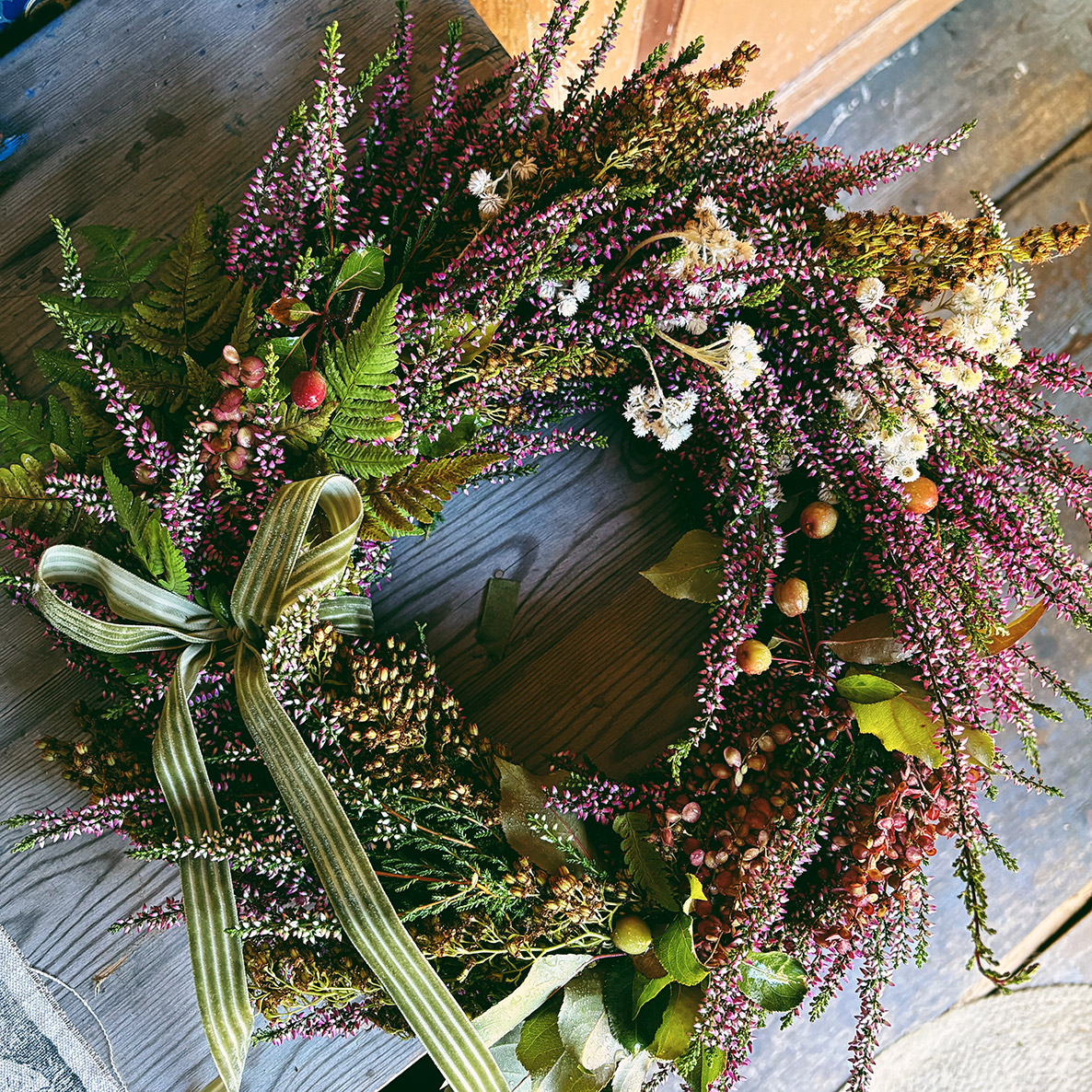 Välkomna hösten med en handbunden krans från Skogsbrynets Trädgård. Passar fint att hänga på ytterdörren eller placera som ett stilleben inomhus. Innehåller bland annat ljung och odlade växter från trädgården. Diameter: ca. 30 cm.